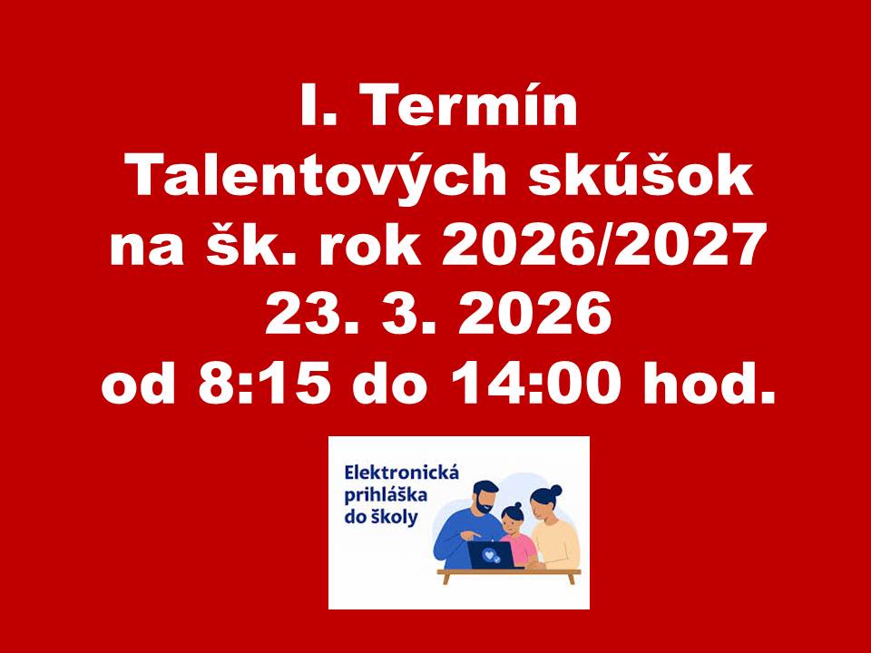 Talentové skúšky 2026 Publikované 13 marca, 202613 marca, 2026 Autor: user Prvý termín talentových skúšok do prvého ročníka v školskom roku 2026/2027 sa uskutoční 23.3.2026 v čase od 8:15 do 14:00 hod v priestoroch školy.Pozvánky pre uchádzačov boli odoslané prostredníctvom elektronického systému E-prihlášky.Tešíme sa na vás.